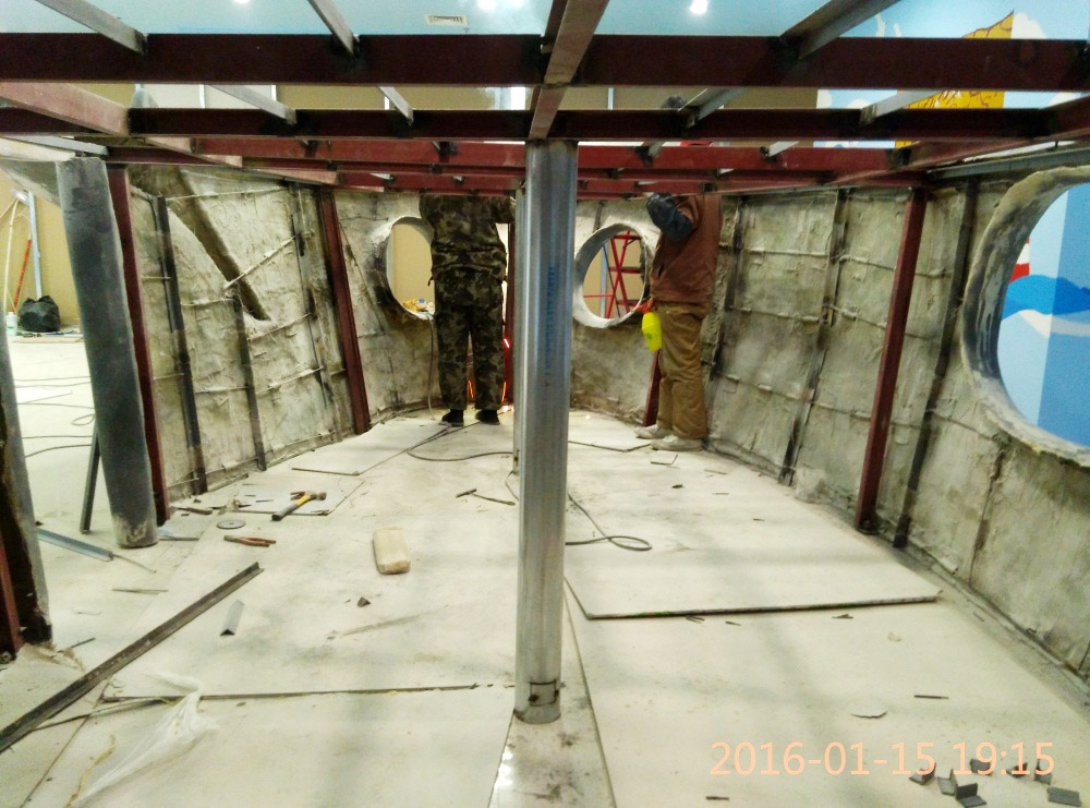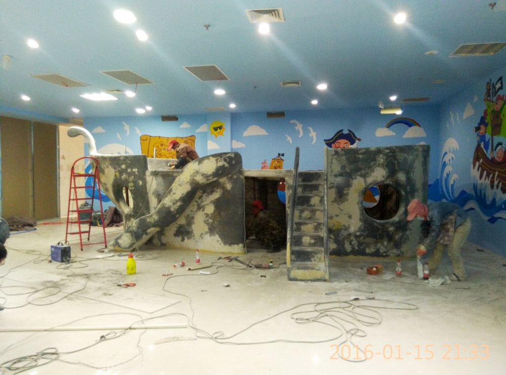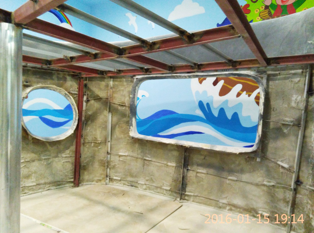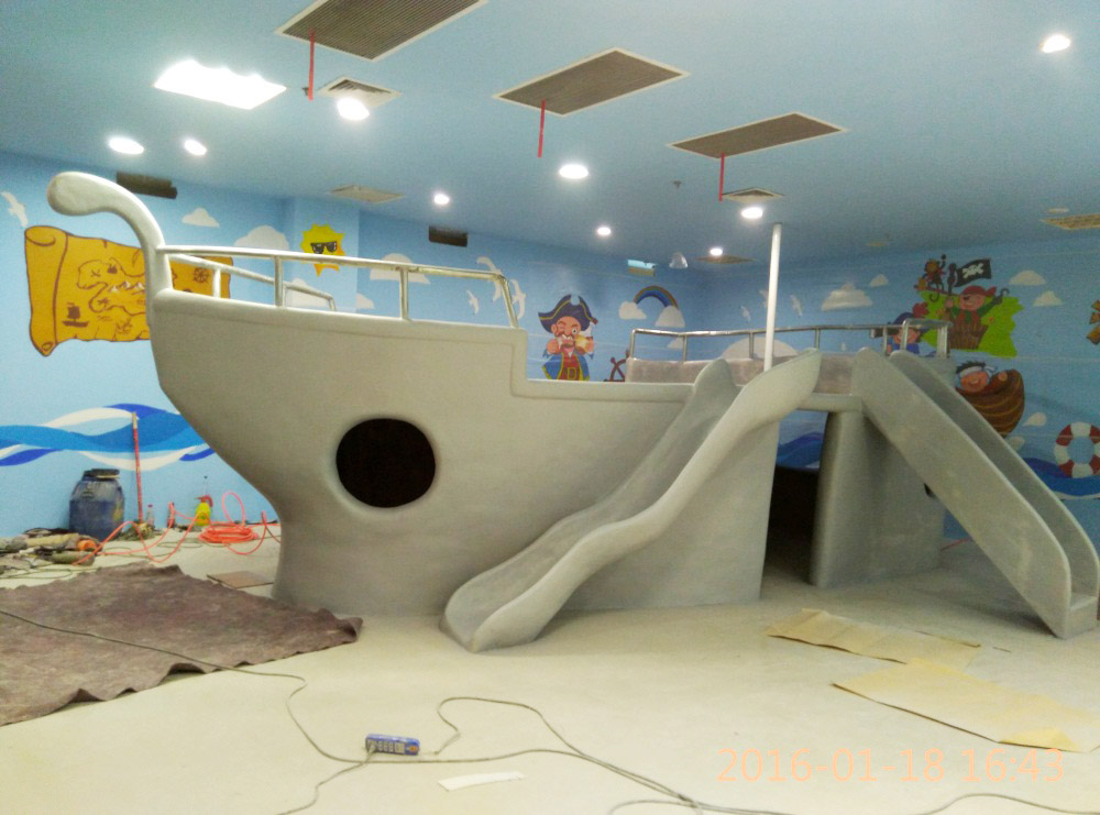 大型玻璃鋼游樂船雕塑竣工。2016年1月15-1月19日安裝于山東省濱州市黃河五路渤海十路銀座商城黃河店四樓。